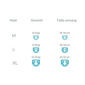 Bamboolik oefenbroekjes zijn er in drie maten. Elke maat is ook nog eens verstelbaar met drukknopen waarmee je het broekje goed op maat voor je kind maakt. In onderstaande tabel zie je de maten, de taille-omvang is opgemeten in niet-uitgerekte toestand.