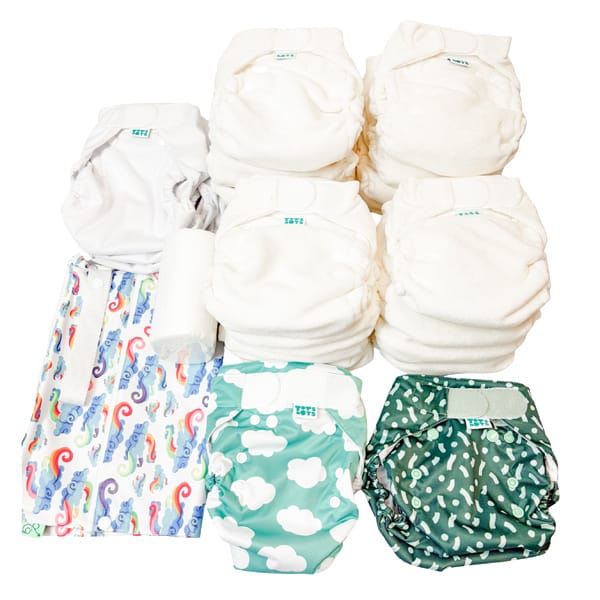 Een heel fijn pakket als je kindje boven de 6 kg is. Het is een tweeledig systeem: een losse luier die erg goed absorbeert, met daaroverheen een waterdicht overbroekje.